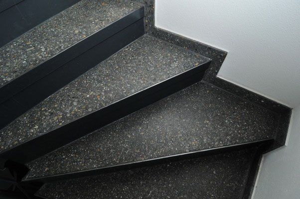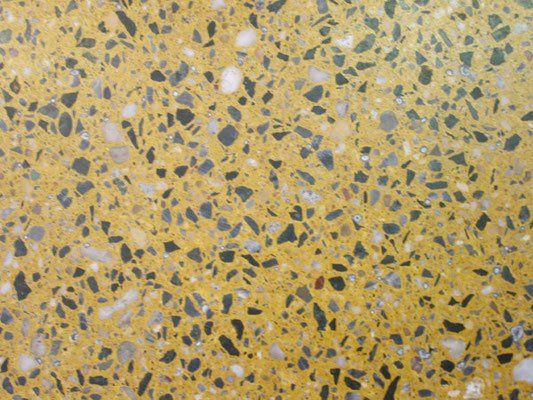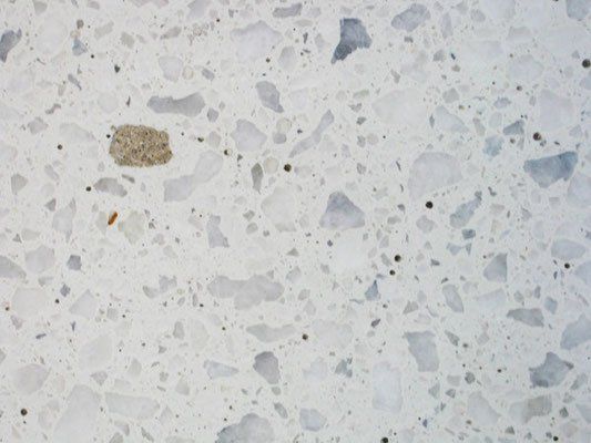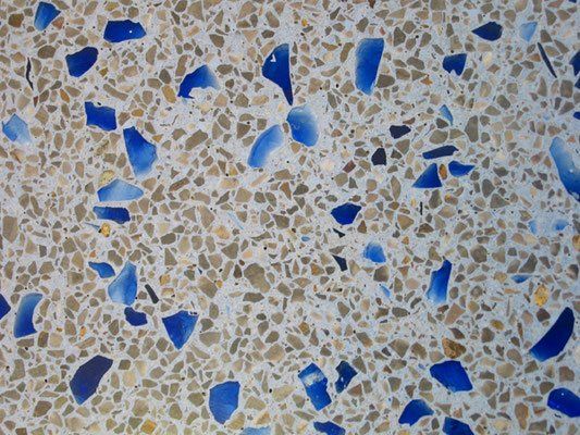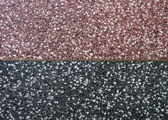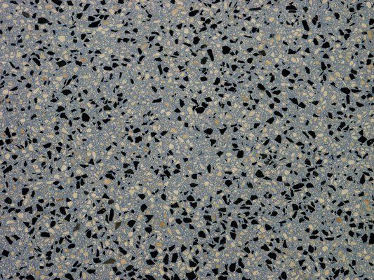 ist Terrazzo ein Belag, der vor Ort trocken gemischt, mit Wasser und hydraulischen Kalken oder Zement vermengt und auf den Boden verteilt wird. Durch die Mischung aus dem gegebenenfalls eingefärbten Bindemittel und den